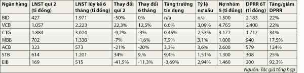 Thống kê sơ bộ kết quả kinh doanh quí 2 và sáu tháng đầu năm của ba ngân hàng thương mại cổ phần (TMCP) gốc quốc doanh và một vài ngân hàng TMCP có quy mô lớn khác hiện niêm yết trên sàn chứng khoán cho thấy bức tranh lợi nhuận không mấy khả quan. Điểm nổi bật nhất là lợi nhuận của đa phần các ngân hàng đều sụt giảm (mức độ nhiều ít tùy từng ngân hàng) và nợ xấu đang có xu hướng tăng nhanh, đặc biệt là nợ có khả năng mất vốn (nhóm 5).