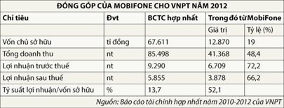 Tương tự Bộ Tài chính lập luận “đòi hỏi” MobiFone “cõng” Công ty Tài chính Bưu điện và phần góp vốn của VNPT ở 62 doanh nghiệp là không thích hợp vì những đơn vị này kinh doanh dịch vụ tài chính, công nghiệp, xây dựng, thương mại... vốn chẳng liên quan gì đến ngành nghề chính của MobiFone. Trên thực tế, câu chuyện nằm ở hiệu quả làm ăn. Công ty Tài chính Bưu điện tính đến ngày 31-12-2012 đã lỗ lũy kế 635 tỉ đồng trong khi vốn điều lệ là 500 tỉ đồng, âm vốn chủ sở hữu 127 tỉ đồng. Còn 62 doanh nghiệp kia, theo báo cáo của chính VNPT, tổng lỗ phát sinh năm 2012 là âm 157 tỉ đồng (15 doanh nghiệp), còn 22 doanh nghiệp khác phải trích dự phòng đầu tư vốn 269 tỉ đồng.